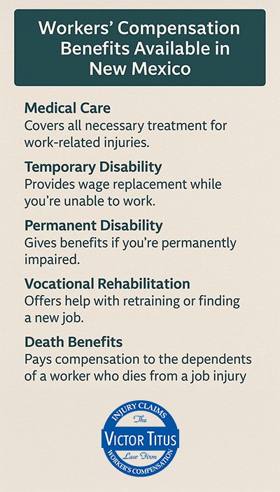 At the Victor Titus Law Firm in Farmington, we work with injured workers throughout San Juan County to ensure they receive the full range of benefits they deserve. Below is a helpful overview of the key types of compensation that may be available to you. Understanding these categories is the first step toward protecting your rights and securing your future.